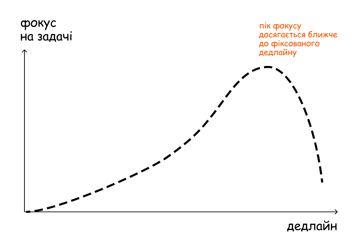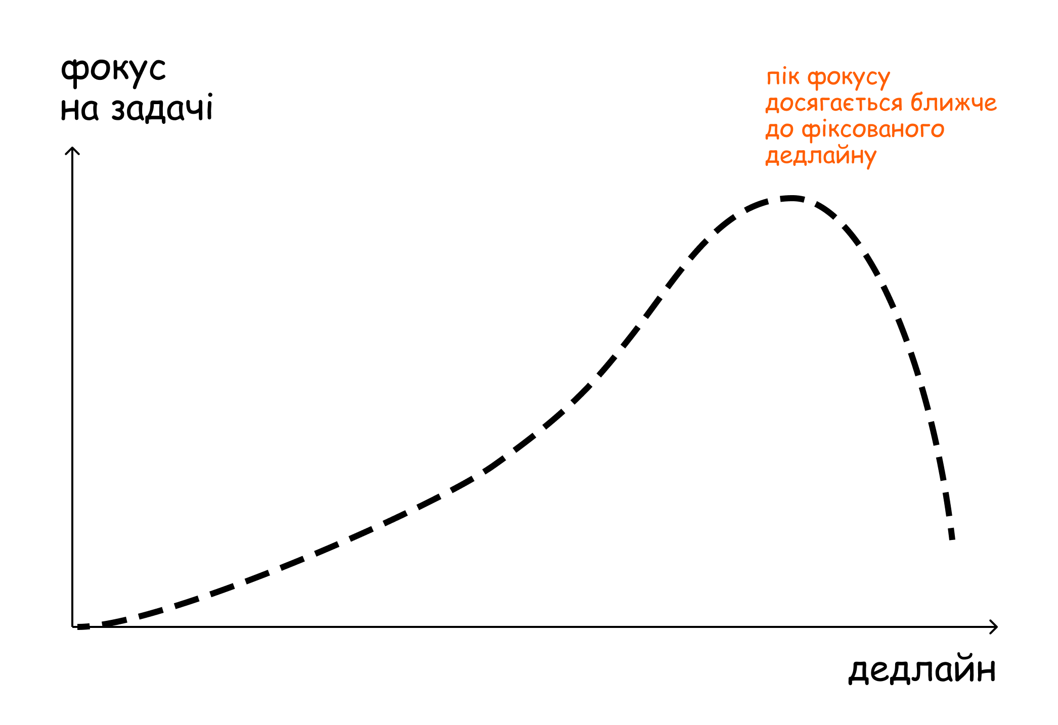 По-третє, прокрастинація. Зусилля і фокус на задачі, часто, розподіляються не рівномірно – максимальна увага і фокус досягається при наближенні дедлайну.
