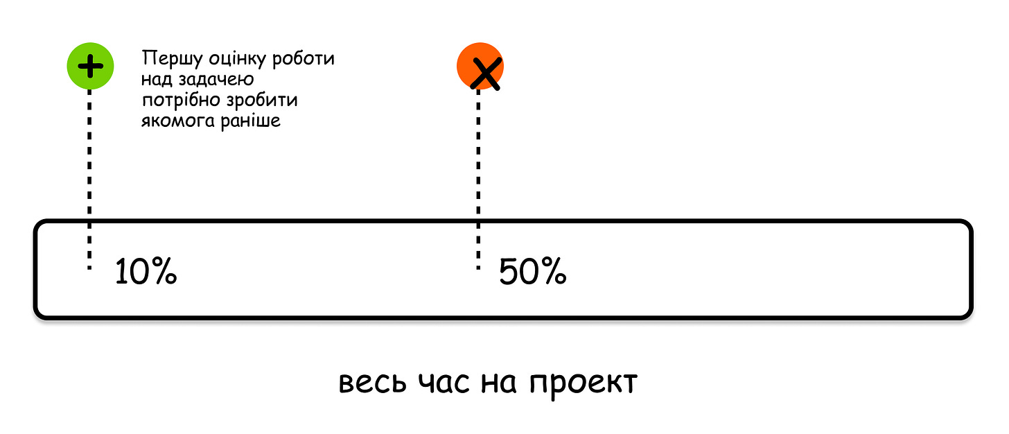 З цього випливає, що я в своєму кейсі (той, що вище курсивом), як керівник помилився в наступному: я неправильно зафіксував строк для першої оцінки прогресу по проєкту. В цьому випадку це було аж через 50% відсотків часу відведеного на роботу.